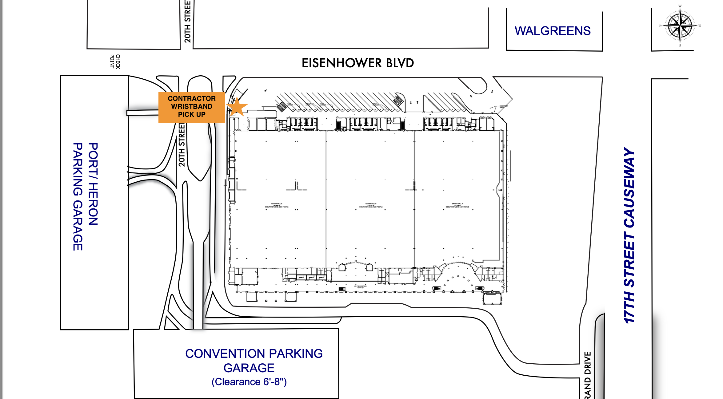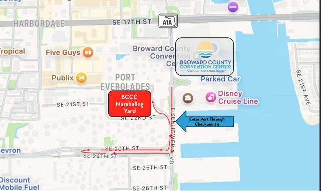 To ensure a smooth build and breakdown experience, we will use a Marshaling Yard to manage all vehicle movements into and out of the loading bay. Once there is space available in the loading bays The Expo Group staff will release you to the loading dock to be unloaded. See map below for directions to the Marshaling Yard. You. must enter the Port Terminal via Eisenhower Blvd through Checkpoint 6. From there see the map for and signage directionals for entrance into marshaling yard off of 22nd Street.