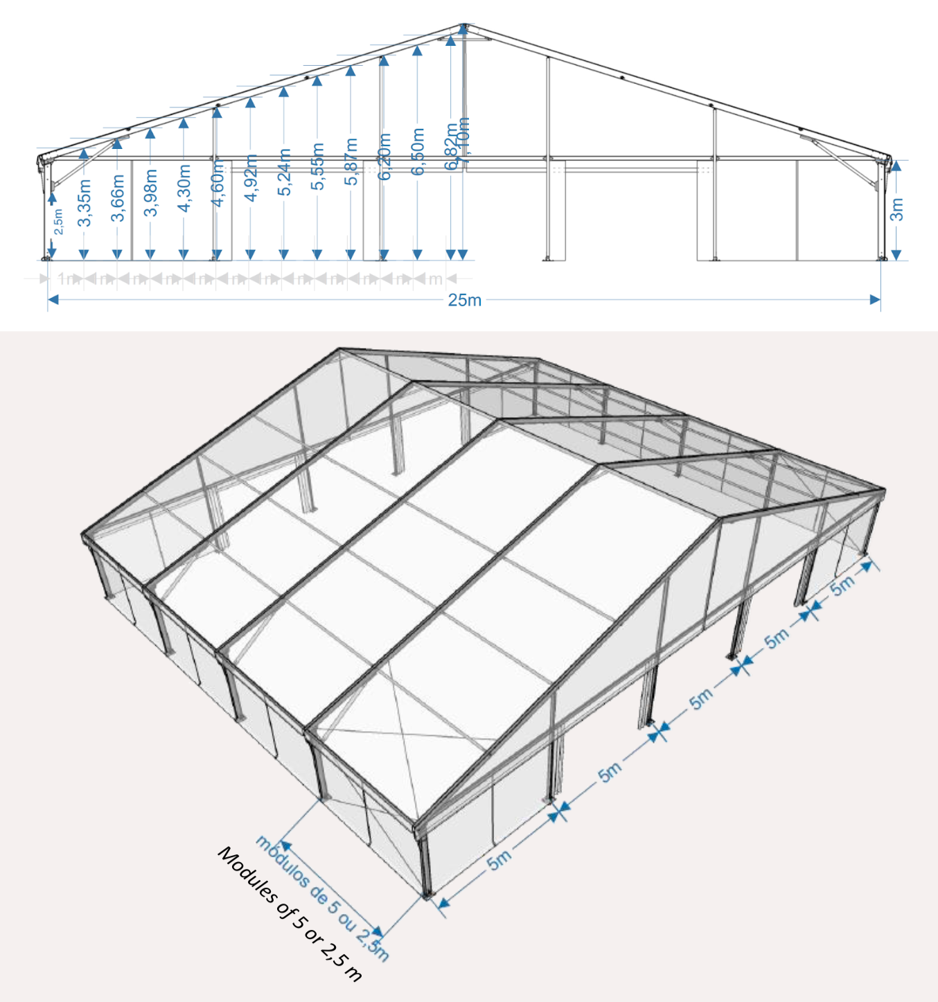 An open sided tent will cover the space between Halls 2 and 3, with dimensions of 25m x 90m (height varies depending on location). Please note that the sides of the tent are approximately 2.5m high due to the supporting struts.